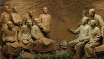 展厅中央有一组名为《1945 毛泽东在重庆》的雕塑,这组雕塑由四川美术学院设计、制作的玻璃钢仿铜雕塑,人物神态传神,栩栩如生,或围坐、或站立,生动地再现了毛泽东赴渝参加重庆谈判期间与各界民主人士共商国是的场面。在雕塑的两侧,半圆弧大理石墙上的八幅铸铜塑像则分别为八个民主党派主要创始人,左侧依次为:李济深、黄炎培、邓演达、许德珩;右侧依次为:张澜、马叙伦、陈其尤、谢雪红。