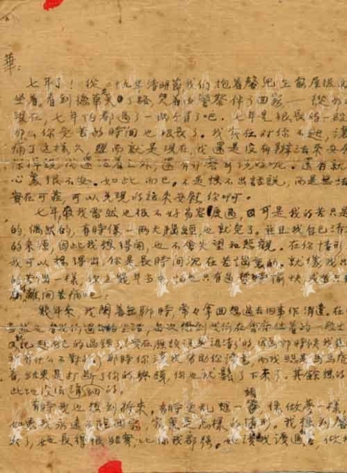 七年了!从二十九年清明节,我们抱着馨儿在屋后面小山坐着,看到德华走失 了路,哭着由警察伴了回家,——从那时到现在,七年怕都过了一两个月了吧。七年是很长的一段时间,那么你受苦的时间也很长了。我实在对你不起,让你苦痛了 这样久,而就是现在,我还是没有办法来安慰你,除掉说我还活着之外,还有什么可说的呢。还有就是我心里很不安。如此而已。不是想不出话说,而是无法说出实 在可靠,可以兑现的话来安慰你啊。